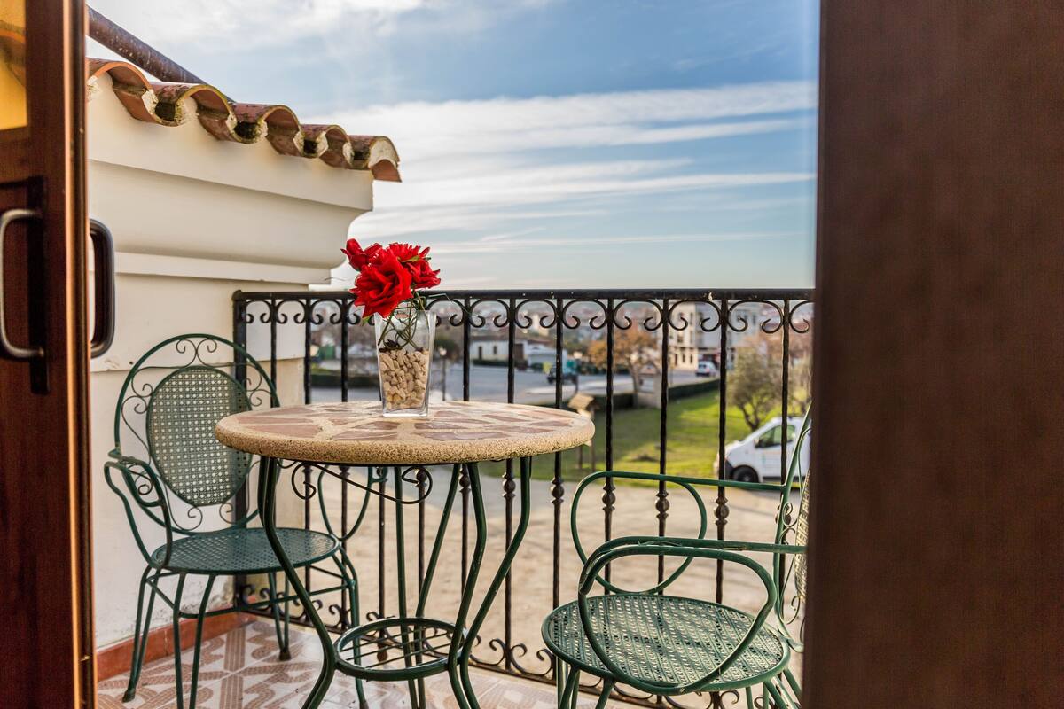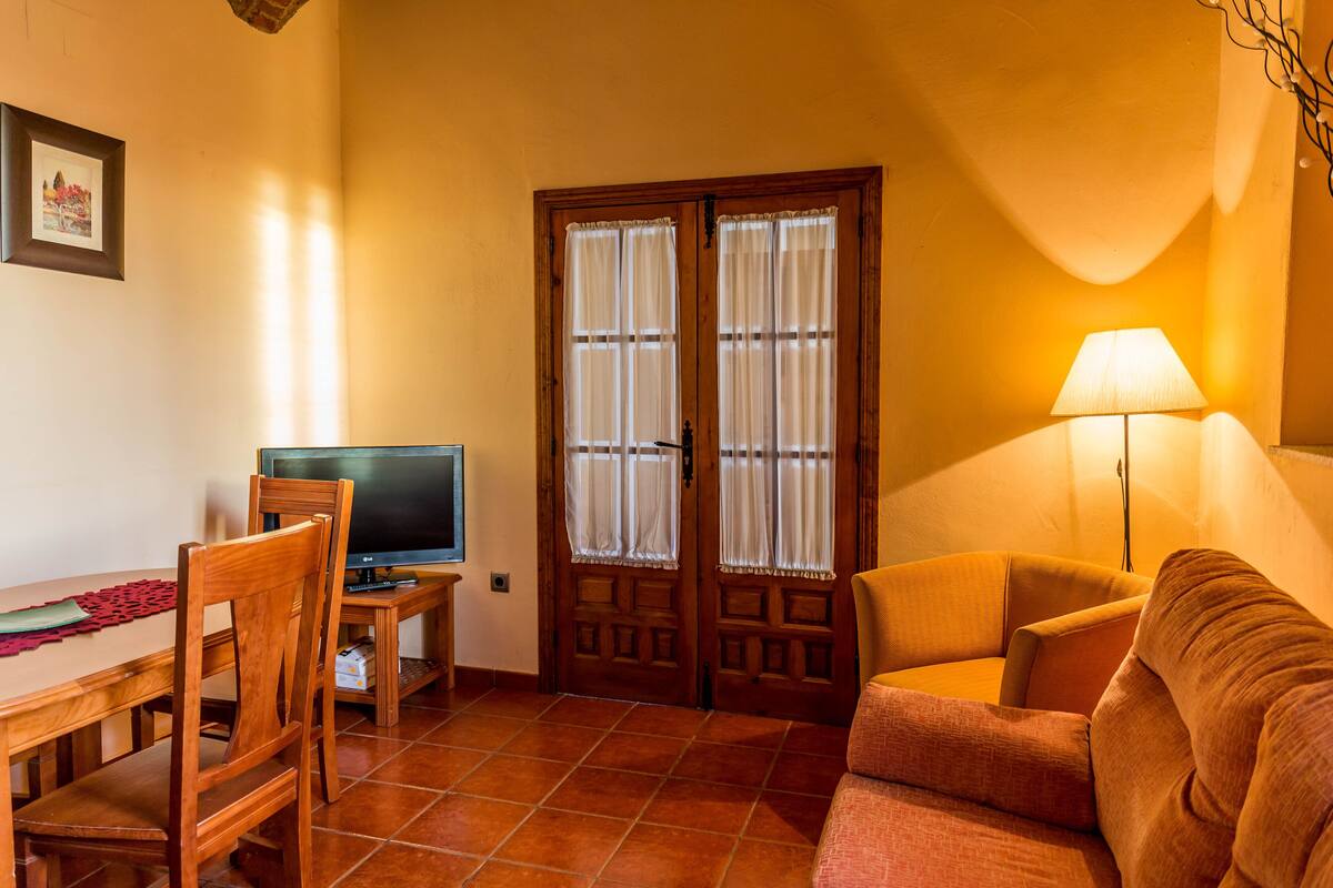 La cocina está dotada de todos los artículos imprescindibles para que puedas elaborar unos exquisitos platos durante la estancia. Durante los días que dure la estancia, vas a poder disfrutar de un desayuno continental, para que empieces con todas las mañanas con la mejor de las energías. Para el descanso durante el día, constáis con una amplia sala de estar, compuesta por un cómodo conjunto de sofás y una televisión. Los baños de la casa, disponen de todo lujo de detalles para que te sientas como en tu propia casa. Para aprovecha al máximo los rayos de sol, puedes relajarte en nuestro solárium en el momento que desees. Del coche no te vas a tener que preocupar, ya que la zona cuenta con aparcamiento. En nuestra, casa tu mascota es otro invitado más. No lo dejas atrás y disfruta de esta experiencia con tu mejor amigo. Cuidamos cada detalle de la vivienda para tu bienestar. Ven a pasar unos agradables a esta bonita zona de Extremadura.